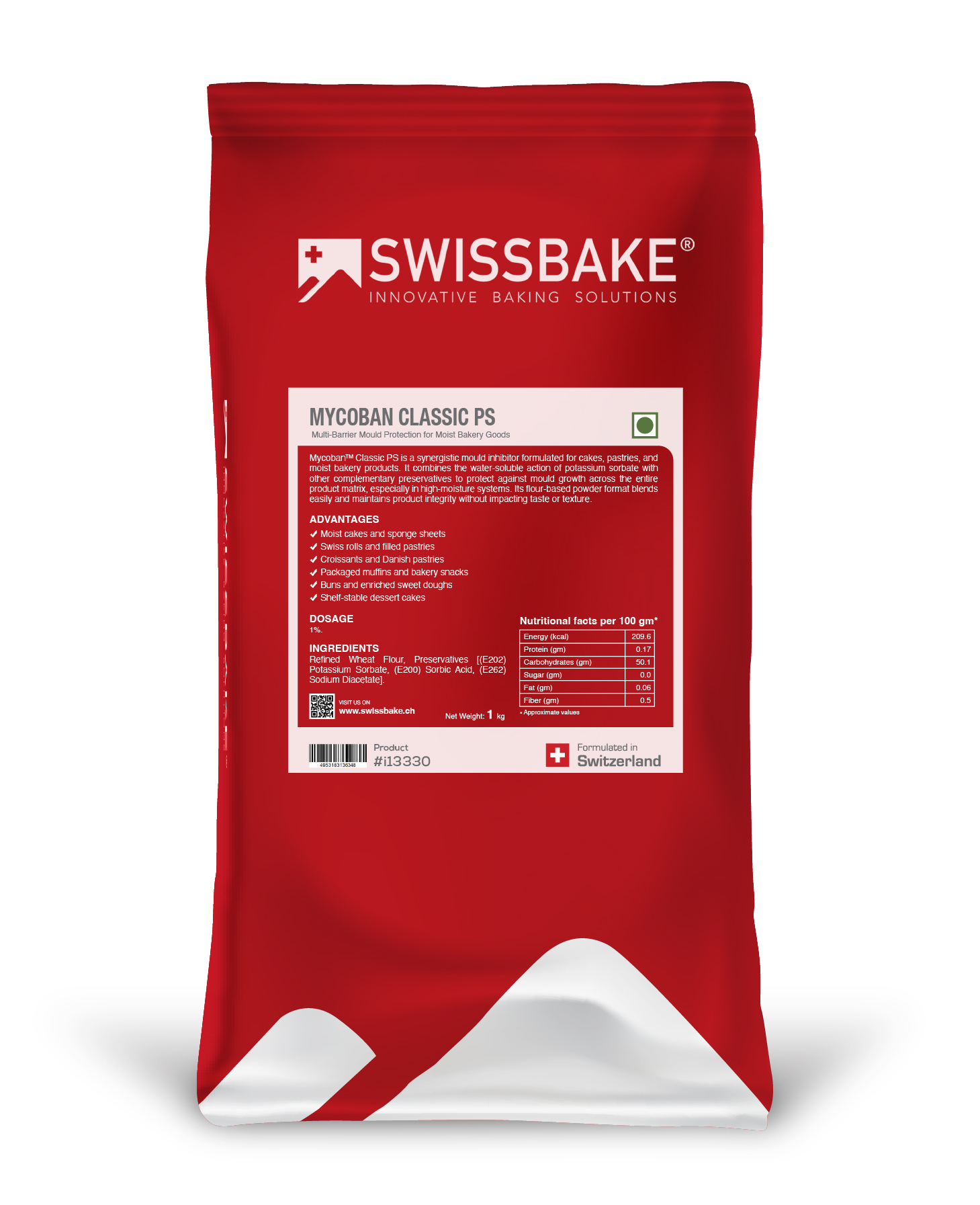Mycoban™ by SwissBake® is a dual-solution freshness protection range engineered to ensure microbial stability in high-moisture bakery applications such as cakes, pastries, and laminated dough products. Harnessing scientifically balanced, synergistic preservative systems, Mycoban™ provides extended mould protection while safeguarding product quality, integrity, and safety throughout shelf life.