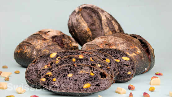 2. Mixing (Spiral Mixer – Direct Method): In a spiral mixer, combine SwissBake® Charcoal Sourteig 25, flour, salt, fresh yeast, and cold water. Knead on low speed for 4 minutes to bring the dough together. Increase to high speed and continue mixing for 5 minutes until a strong, elastic dough forms. In the final minute of mixing, reduce to low speed and gently incorporate the white chocolate and pistachios until evenly distributed. The Desired Dough Temperature (DDT) should be 24°C–26°C.